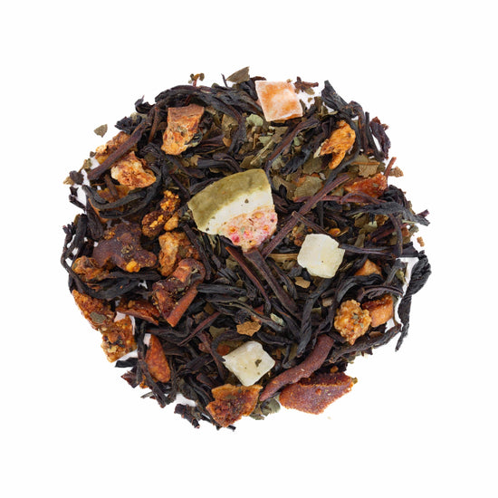 Fruit tea with roasted pear pieces, Sri Lankan black tea, blackberry leaves, papaya, and figs. Delicate fruity notes with a refined aroma. A tea experience crafted for the discerning tea drinker.